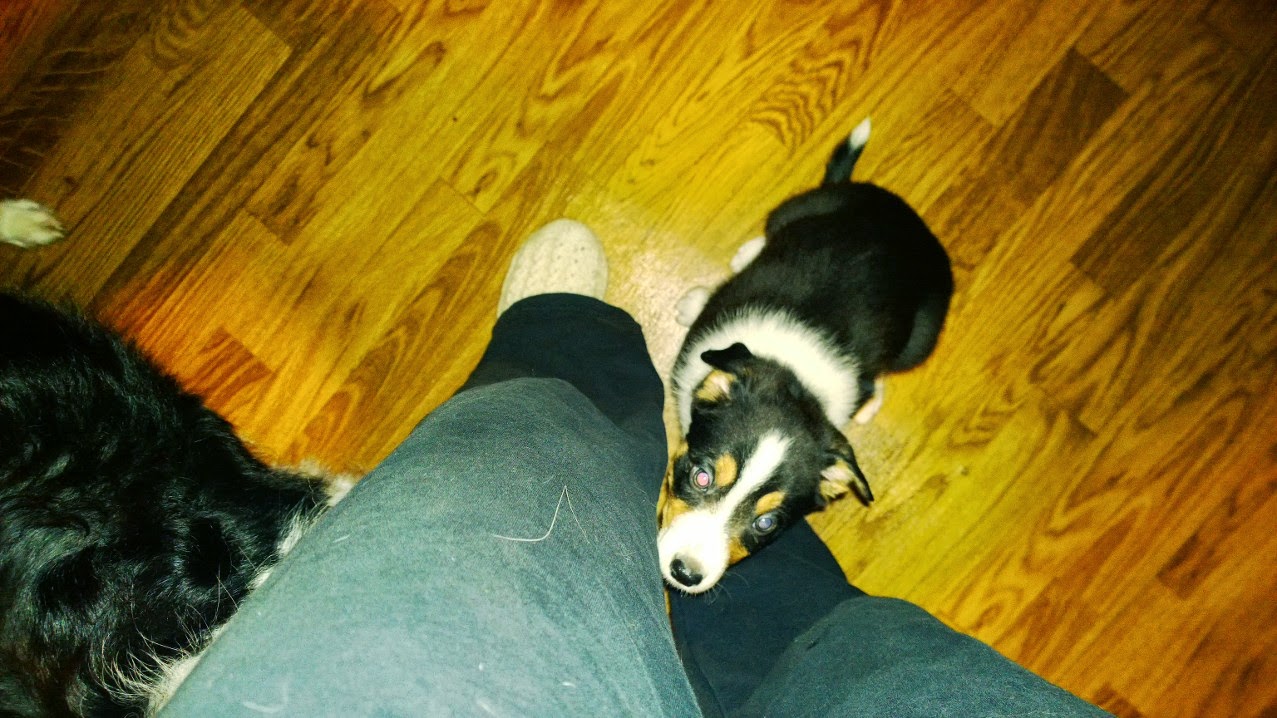 Illalla sitten Kasin kanssa jo tosi nätisti leikkivät. Kasi meni maahan makaamaan ja antoi pennun kiipeillä päällään. Se on aivan haltioissaan tulokkaasta. Jolly aloitti heti opettamaan tavoille, eli komensi pois rapistelemasta kiellettyjä paikkoja. Jake ei tullut lähellekään vaan mökötti milloin missäkin. Pro ja Laki olivat aika välinpitämättömiä. Eka yö meni hyvin, kaksi kertaa nousin viemään tarpeille, muuten oli aivan hiljaista. Varmasti väsytti kaikki muutos ja uudet kaverit.